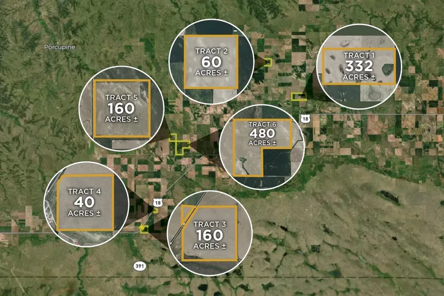 1,332 acres of productive farmland divided into six tracts across Bennett and Oglala Lakota Counties in southern South Dakota. The tracts range from 40 to 480 acres and are predominantly tillable, with most properties featuring Class 1 and Class 2 soils and CPI ratings generally ranging from the low 70s to the upper 70s. Tracts have a history of corn production, and some include a former wheat base. Access is provided by maintained county roads and Highway 18, supporting reliable year-round agricultural operations. Electrical service is available to all tracts, and the properties are located near local grain elevators, supporting efficient harvest logistics. The properties are well-suited for continu...