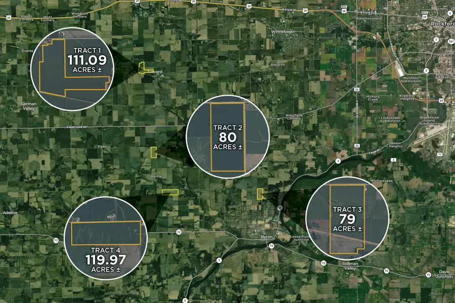 We are excited to be able to offer a legacy farm in 4 tracts, presenting a versatile mix of property sizes but all providing quality farm tracts with close proximity to one another. Every tract has a gentle roll with high productivity indexes between 115 - 135. The Winnebago County farm is located just west of Seward Illinois along Kelley Rd, consisting of 111 to be surveyed acres. Traveling slightly south of Seward into Ogle County you have Tract 2 consisting of 80 acres with good road frontage along N. Pecatonica Rd. and multiple farm entrances. Tract 3 is located north of Byron along E. Lynn Rd with a gentle contour. Tract 4 is located directly to the west of Tract 3 a...