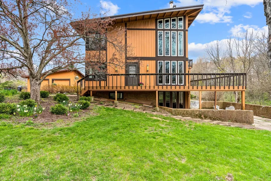Don't settle for ordinary! This gorgeous 2-story contemporary style home offers 4 bedrooms, 3 full baths and is situated on 3.22 wooded acres. Floor to ceiling windows (with remote blinds) allow for the home to be drenched in natural light. Stunning wood ceilings throughout and pegged oak flooring add warmth and coziness to the home. Very Cool Wood Burning Fireplace is the focal point of the 2-story living room. Updated kitchen with granite counters and white cabinets is spacious and open to the breakfast nook and dining room on opposite ends. Master bedroom overlooking the living room includes its own private balcony and a dressing room that connects to the bathroom with jet tub and heated floors. Walk-out lower level with generous sized rec room has tons of built-ins and a very useful hobby room. The 2-car garage is drywalled and temp controlled with upper storage and a greenhouse attached. Storage building has full electric. There is even a cute playhouse at the top of the circle drive. The huge deck wraps around the home and is the perfect spot to relax and take in the beautiful grounds. Many updates have been completed within the past 5 years including windows, kitchen, bathrooms, A/C and softener. This is truly a unique home!!