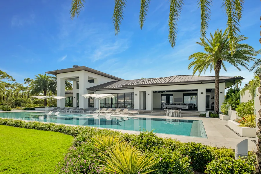 Lifestyle amenities such as the 88-foot perimeter overflow saltwater pool, private dock with boat lift and jet ski docking, covered patio with Wolf outfitted summer kitchen, and a conversation pit-inspired bayside lounge space ensure relaxation and entertainment opportunities are never in short supply.