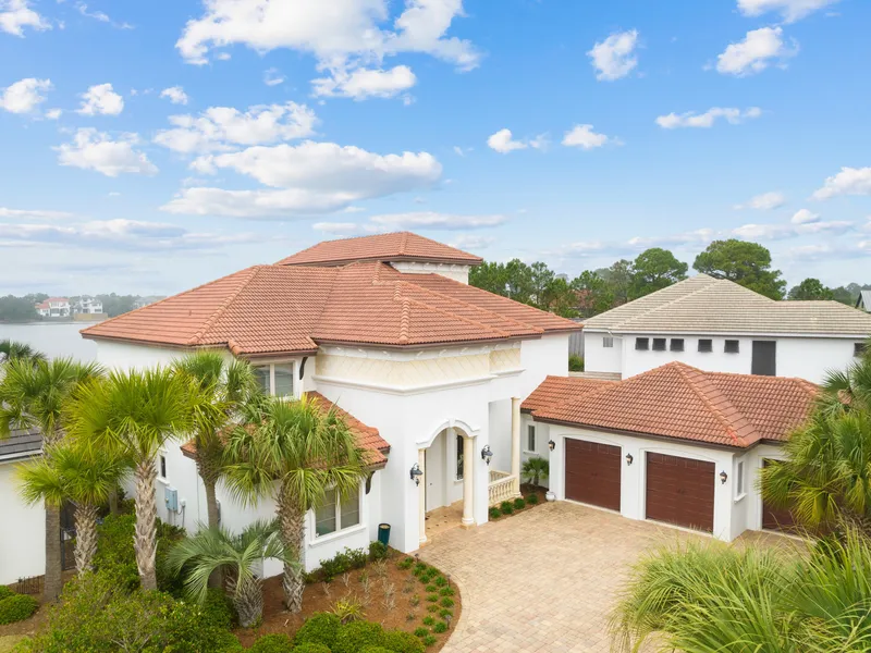 Effortless waterfront living and elegant Spanish design unite at this expansive Mediterranean-inspired home located within the private, gated community of Destiny East. Spanning nearly 4,900 square feet, this five-bedroom, six-bath home provides quality construction, an enviable location within the community, and traditionally upscale fixtures to create a uniquely desirable compound, footsteps from sugar-sand beaches. Concrete block construction on the main level of the home is accented by oversized culinary and dining spaces, including a dedicated formal dining room, charming breakfast nook and eat-in bar island surrounding custom cabinetry, Thermador appliances and timeless tile work. Luxurious appointments continue into the large living and sitting area, adorned with custom built-in shelving, a gas fireplace and vaulted ceilings with two levels of windows providing breathtaking natural light to dance throughout the home. The main level of the property also provides a grand owner’s retreat featuring a lakefront suite-style layout with a private ensuite bathroom with jetted tub, large sitting area and access to the outdoor lanai with a fully screened outdoor pool, summer kitchen and al fresco dining space. The second level of the home offers ample accommodations for large groups or families providing three additional guest bedrooms with ensuites as well as a spacious third-floor flex room with wet bar and balcony access, perfect for a fifth bedroom, media room or executive office. Additional features of this substantial offering on the eastern edge of Destin include a three-car garage, coffered ceilings and a third-story watch tower to enjoy the endless vistas of the surrounding lake and Gulf of Mexico to the south.