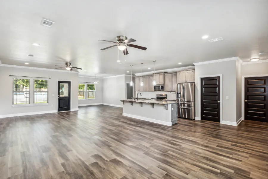 Stunning Custom-Built Pool Home - Practically Brand-New! Welcome to this magnificent 4-bedroom, 2-bathroom custom home built in 2021. Boasting a massive open floor plan, the kitchen is a chef's dream with gorgeous cabinets, granite countertops, a large deep sink with a tap faucet, a massive walk-in pantry, and quiet-close cabinets. This home is in pristine condition and loaded with upgrades! Enjoy the new luxury vinyl plank flooring, cordless blinds throughout, stainless steel appliances, and elegant crown molding. Each bathroom is equipped with beautiful cabinets, luxury vinyl plank flooring, and granite countertops. The master bathroom features a stunning walk-in tiled shower.