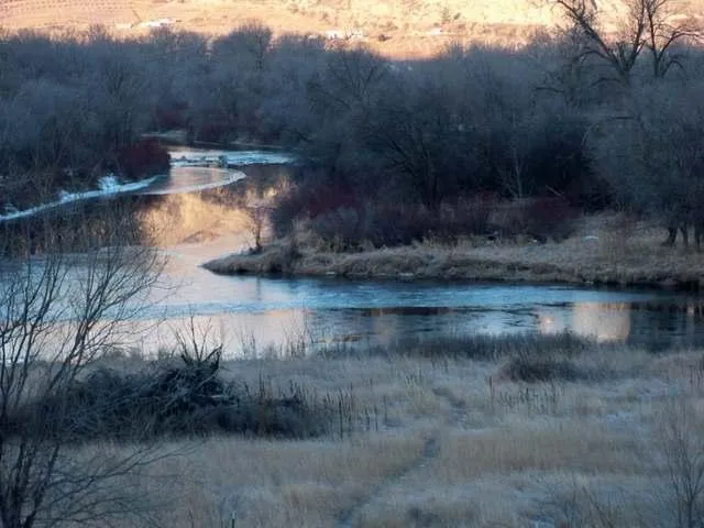 97 riverfront acres. Some low bank (designated flood plain but no floods in memory), some mediul and some high bank. Big barn and smaller hay shed, wetland with high ground would make a good hunting club, main portion undeveloped would make an excellent rodeo grounds. Large animal vet clinic is adjacent, large hardware outfit adjacent, highway frontage, a mile to Orville. Too many possibilities to name them all, come and look for yourself.