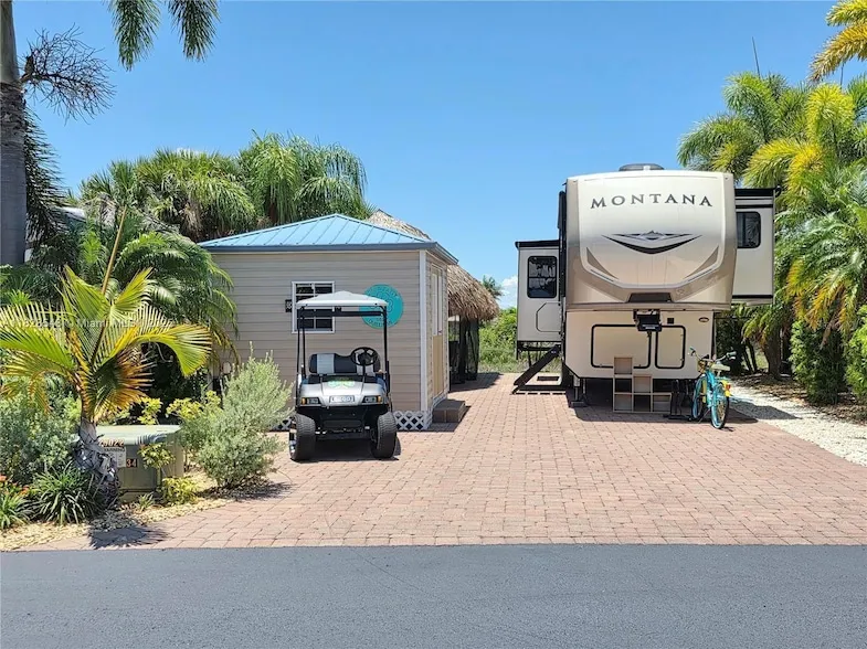 SILVER PALMS 5 STAR RV RESORT - This beautiful property is on the preserve that is teeming with wildlife in the rainy season. The landscaping is superb. Sitting in your Tiki in the evening watching the spectacular sunsets, the Tiki is all screen in for your comfort. The Tiki is 10x28, Casita is 10x12 and you can build to your own specifications. The property includes a 2020 Montana 5th Wheel. It has hydraulic jacks, pantry, washer/dryer. This is an active resort with 9 pickleball courts, clubhouse, heated pool, Jacuzzi, poolside bar and grill, fitness center, billiards room, fitness center, card room and much more. Golf cart comes with the package, all six batteries were replaced in December 2024. Roof on camper redone in December 2024. Right across from the clubhouse. Perfect location.