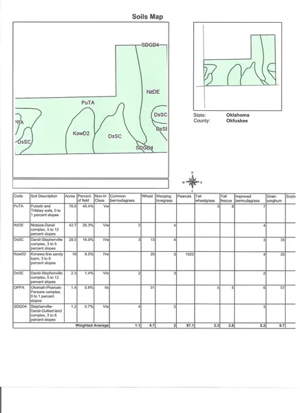 160 acres m/l. Okfuskee County Oklahoma Land for Sale. Located 2 miles off Hwy 48. 17 miles South of Bristow and I-44 in Northern Okfuskee County. 45 miles Southwest of Tulsa and 80 miles east of Oklahoma City. 3/4 of a mile road frontage on south side and 1/4 mile on west side. A Creek runs through this property about half of this land is good creek bottom with big trees and some thick timber. Good soils for food plots. A great recreation property and a good place for cabin/house. Rural Water and Electricity on South side of property. Lies in Section 15-13N-9E Okfuskee County Oklahoma. Price: $210,000