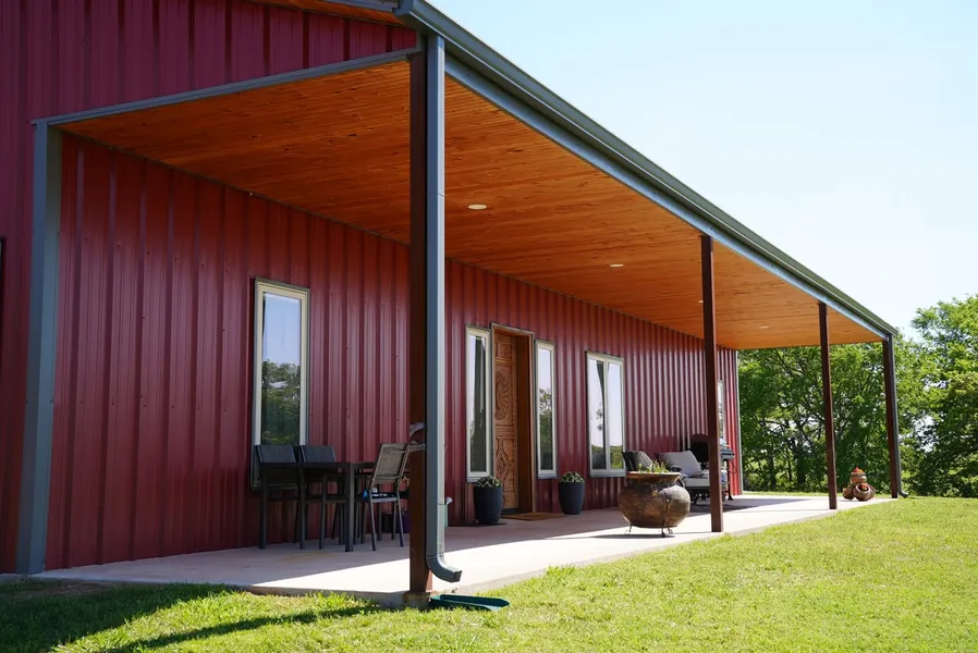 Located in Okfuskee County, just 32 miles from Shawnee, Oklahoma. This 25 +/- acre property (Tract 3) is a true paradise whether you are looking to farm, ranch or have a recreational haven. A new graveled driveway with a gated entrance winds through the mature oak timber and manicured pastures to this stunning 3 bedroom 2 bath (2,160 sq ft) Barndominium, built in 2021 with an attached 2 car garage, a covered 12ft x 76ft front porch and 10ft x 82ft back porch area. The open floor plan and ample windows allow for breath taking views of the rolling open pastures and the North Canadian River bottom. The very spacious kitchen, is warm and inviting with custom knotty alder cabinets and quartz countertops that follow through to the pantry and mudroom. The living room features a wood burning stove and vaulted ceilings. Luxury vinyl planks run througho...