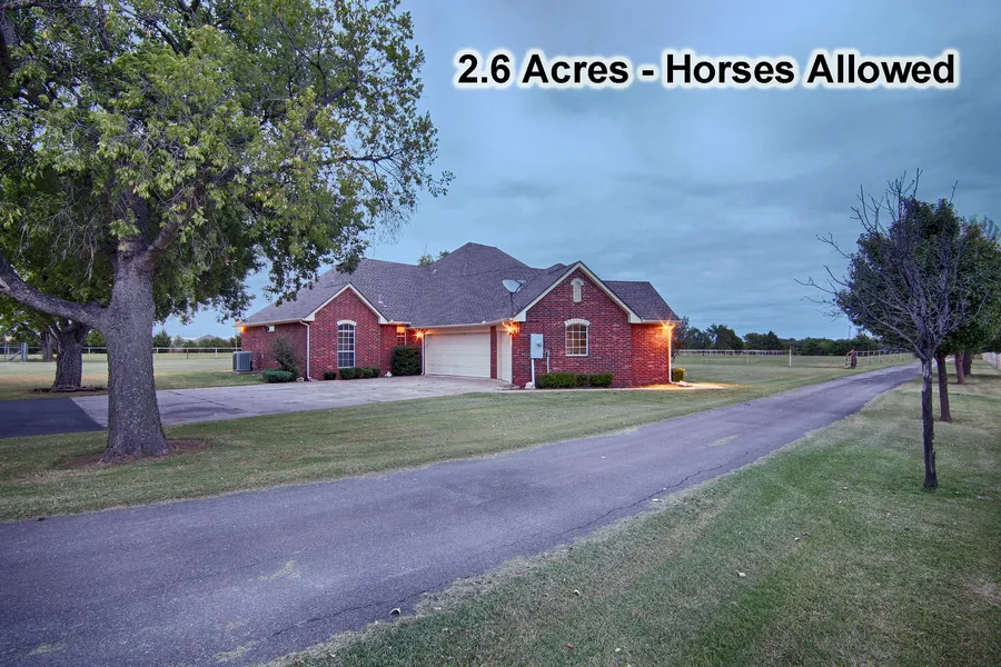 Newer Home on 2.6 Acres - Close to Town - Horses Allowed - Edmond Schools - Additional Land Available up to 6.9 ac total. Custom home with tasteful design & finish. Kitchen features granite counters, tile backsplash, maple cabinets, double ovens, breakfast bar and...the walk-in pantry is a safe room. Crown molding in main living areas & kitchen, glazed paint in formal dining & entry, solid wood doors. Most fencing already in place (pipe & cable). Additional 4.3 adjacent acres for sale.