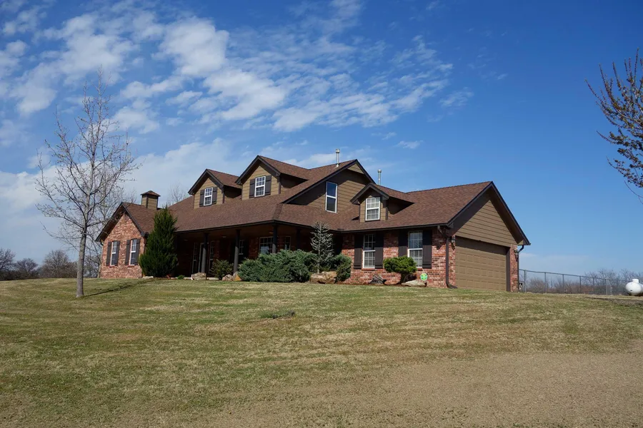 Beautiful, 4 bed, 3 bath home on 5 acres, two living areas and dining area. Updated interior and exterior paint, updated flooring in first level common areas, and new light fixtures and hardware throughout. Fireplace in living room, two inch wood blinds throughout, large walk-in closets in three of four bedrooms, 2 in master bedroom, jacuzzi tub and separate shower in master bath, double vanity with tiled countertops. Fenced backyard, storm shelter, large 30x55 shop that is heated and insulated. Horses allowed, $20 annual HOA fee.