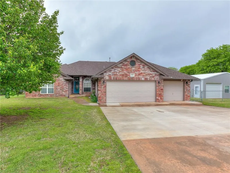 Lovely home on a beautiful 1 acre lot with 30x50 shop. Inside has updated paint and fixtures throughout, newer carpet, HVAC, dishwasher, and all LED lighting. Large storm shelter in 3 car garage. Shop w/ 2 overhead doors and 1 walkthrough door has electric and internet connections, as well as 3 AC/Heaters. 30X30 of the shop has been fully insulated and drywalled. Backyard is fully fenced with back porch off of the house, large sports court with basketball goal, covered patio with serving bar, electrical outlet, internet connection, and ceiling fans, fire pit with woodpile, large playscape with swings, slide, ladders, and rock wall, and LED lighting. Conveniently close to Tinker AFB, Boeing, Rose State College, and more. Call now for a private showing.