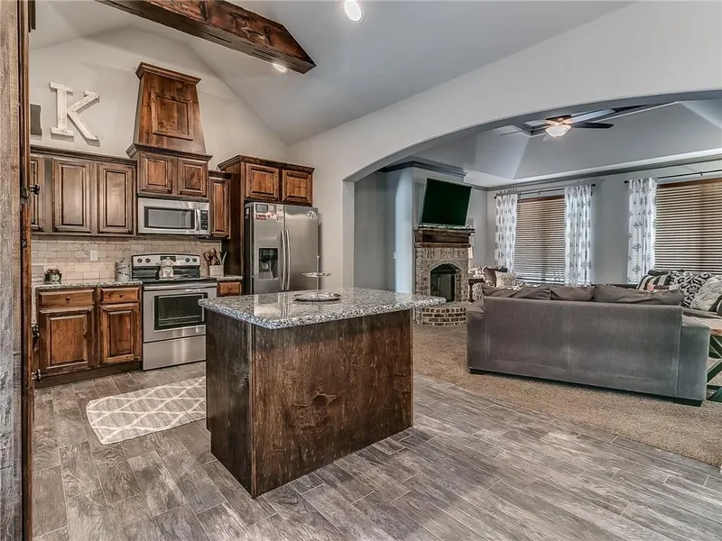 Stylish home has a great floor plan, very open with a good flow! Granite counter tops, including a large island. Beams in kitchen ceiling add a distinctive touch! Gas log fireplace is focal point for the living room. Lots of large windows for natural light. 3 bedrooms and 2 bath down, finished bonus room and an office upstairs. Could be an exercise or media room, or craft area, already has craft table and craft supplies storage already in place. Master has a walk in closet and access to the large covered patio. Master tiled walk-in closet and access to the large covered patio. Master tiled walk-in shower plus a soaker-whirlpool tub. Storm shelter in garage floor. Lovely fenced backyard with over sized covered patio facing East for evening shade.