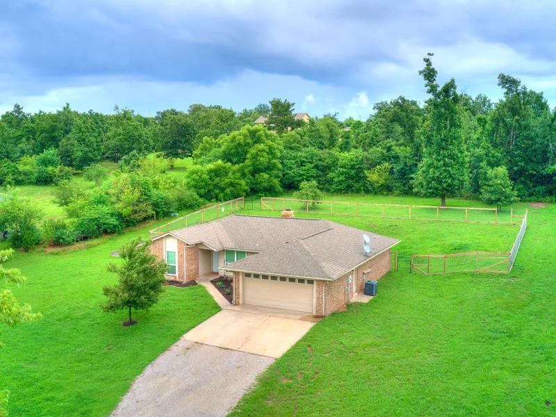 Feel the freedom and feel right at home on this 1.25 acre country home. There is plenty of room to roam in this neighborhood. Easy access to I-40 for a quick commute to Oklahoma City and close to the new turnpike to take you to Edmond and/or Tulsa. The home has been professionally cleaned and cleared out so it's ready for new homeowners. The kitchen has stainless steel appliances with a built-in microwave above the stove and the refrigerator stays with the home. Laundry room is just off of the kitchen and 2 car garage. Step down from the kitchen into the living room with a beautiful tile floor and huge fireplace with a wood burning insert. It really puts the heat out on cold winter days that will help keep down your electric bill. From the living room to the South you'll enter the primary bedroom with a walk-in closet and complete bathroom with a large tiled shower. From the North of the...