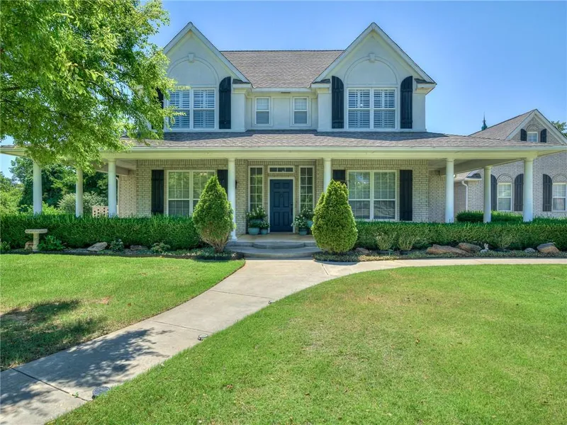 Across from Lune Lake, Rabbit Run's private, stocked, community lake and backing up to a greenbelt is the elegant farm style home of your dreams. Atop the gently rolling hill dotted with mature trees you are greeted by a wrap around porch with inset lighting and outlets. Entryway with coat closet, formal dining to the right or to the left the true office with French doors next to main floor full bath and hall built-in. Follow through to the living room with vaulted ceiling and see-through fireplace to second living space. Open floorplan living/kitchen separate by large usable island with bar seating for dining or a breakfast nook. Dedicated laundry has storage as well as access to one of two screened patios which lead to the crowning glory of this home- the recently installed inground, heated, mineral pool with lounging pad and hot tub. Master suite features double sink vanity and jetted...