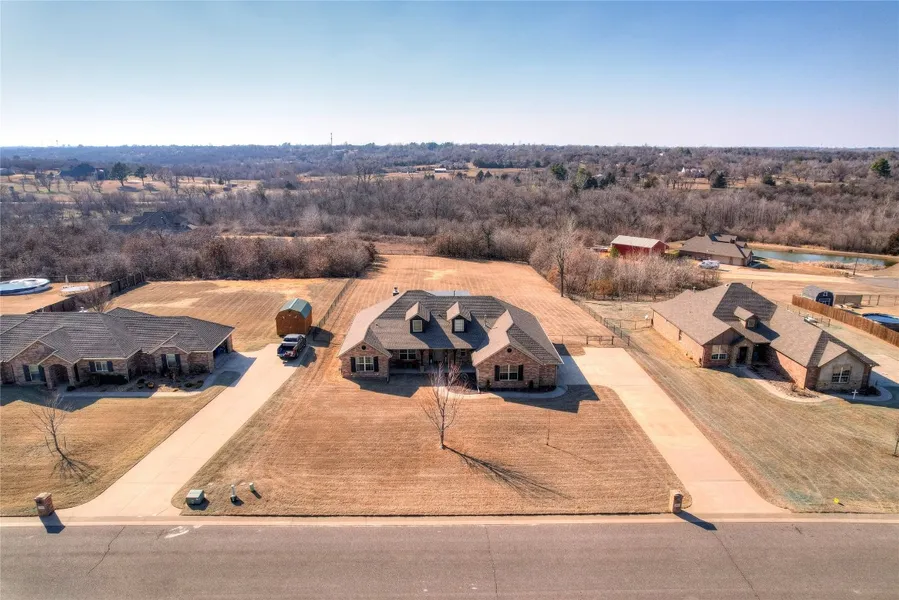 Welcome home to privacy and tranquility. Offering 1 acre (mol) of land close proximity amenities, highways, and Tinker AFB - what more could you ask for? With beautiful curb appeal, you will be greeted with a large front covered porch as you enter the home. An abundance of natural light and open floor plan make for a versatile yet flexible floor plan for any family. The living room with gas fireplace is open to the kitchen making it a perfect space for entertaining. The kitchen features many upgrades including granite countertops, breakfast bar, stainless steel appliances and brick feature wall surrounding the walk-in pantry. The primary suite is opposite of the other 3 bedrooms making a total of 4 bedrooms. The primary suite via french doors is spacious allowing for a nice siting area. The primary bathroom offers double vanities, garden tub, walk-in shower, private water closet and large 3 tiered walk-in closet. All additional bedrooms are roomy with spacious closets. There will not be a lack of storage in this house with many storage closets throughout the home. In addition to 2 full bathrooms, you also have a half bathroom for guests. The 3 car garage includes a reclaimed wood wall with built-in work station. Finally, saving the best for last, the outdoor space offers a massive 20'x24' covered pergola, additional concrete patio and large oversized storm shelter. The backyard is fully cleared, fully fenced and backs up to a wooded area. The neighborhood is peaceful and quite and offers two fishing ponds. So much to offer and must see it for yourself! Schedule your private showing today!