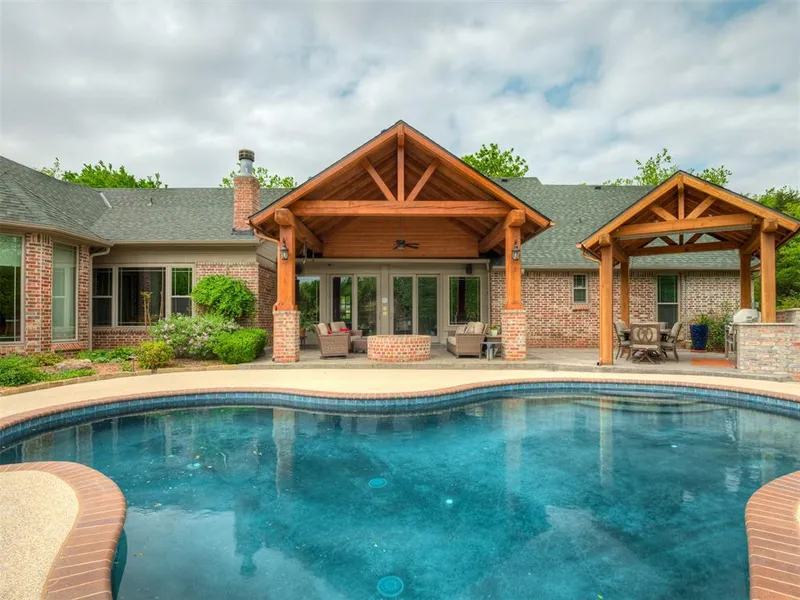 Located in Deer Creek School District, this remarkable home sits nestled on 3.49 acres amongst mature trees & lush plants. Featuring a new roof in fall of 2023, in-ground storm shelter, fire suppression system, central sound system in main living areas, primary suite, & patio, generator, geothermal heat & air, spray foam insulation in attic, stunning water feature in backyard, numerous remodels & updates to epoxy garage floor, soft rock around pool, newer windows, paint, flooring, & bathrooms-this home has it all. The long drive & add'l parking welcome you to an expansive front porch that is perfect to enjoy your morning cup of coffee or evening glass of wine. Through the front door you are greeted w/the warmth of feeling at home. A stately hearth is the focal point of the room while elegant wood beams tie the space together. The sizable dining area & kitchen sit open to the living room & boast considerable storage, top of the line appliances, custom paint, backsplash, countertops, & vast window above the kitchen sink that overlooks the gorgeous front yard. On the opposite side of the living room, the den provides a quiet space to read a good book or watch your favorite movie. Down the hall you find the 3 secondary bedrooms. Two of which share a Jack & Jill bathroom & the 3rd offers an ensuite bath & large walkin closet. All are quite generous in size w/roomy walk in closets. Thoughtfully located on the other side of the home is the copious primary retreat w/sitting area overlooking the utopic pool & hosts a grand space to decompress when needed. Primary bath has separate vanities & huge walk in closets, a large soaking tub & walk in shower. Next to primary retreat & around the corner from the kitchen are the half bath & laundry room. Up the stairs at the end of the hall are the enormous bonus room & office space. The beautiful backyard landscape offers the perfect space for memorable moments grilling in the outdoor kitchen while your guests take a dip in the pool.