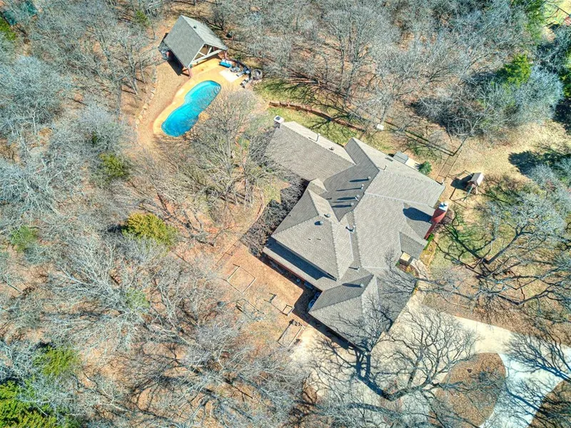Welcome to your own private oasis, tucked away on a stunning wooded lot! This exceptional property offers a rare blend of privacy, luxury, and convenience. This home is designed for comfort with spacious living areas, quality finishes, and views that bring the beauty of nature indoors. With 5 bedrooms, an office and a flex space/bonus room, you'll never be short on space. Don't miss the hidden closet in this home underneath the staircase. Step outside to a covered patio overlooking your own backyard paradise—an in-ground pool surrounded by mature trees, creating the perfect setting for summer days and evening gatherings. A true additional dwelling unit on the property provides endless possibilities, whether you need a private guesthouse, pool house use, or just a private space as a home office. Located within minutes of top-rated Edmond schools, shopping, and dining, this property offers the best of both worlds—seclusion without sacrificing accessibility. Interstate access is just a short drive away, giving you quick access to local shopping, and an array of restaurants. Just in time for summer- the pool is open and ready for your enjoyment all summer long! This home comes with a Class 4 impact resistant shingle to help keep insurance costs as low as possible. This is more than just a home—it's a lifestyle. Properties like this don't come along often, and when they do, they don't last.