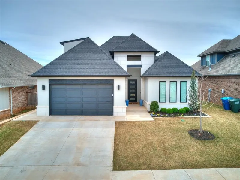 Welcome to this elegant two-story home located in the desirable Lakes at Cross Timbers neighborhood. Built in 2022, this better-than-new construction has been thoughtfully upgraded and meticulously maintained. With 4 bedrooms, 3 full bathrooms, and a convenient half bath, the home offers the perfect layout for comfortable family living and effortless entertaining. The spacious downstairs primary suite features a spa-like en suite bath, creating a private retreat. A second downstairs bedroom includes a dedicated full bath with a walk-in shower-ideal for guests or multigenerational living. Upstairs, you'll find two additional bedrooms and abundant closet space throughout. The bright, open floor plan is complemented by high-end finishes, including custom white oak built-ins and stunning maple wood floors throughout the lower level. A modern electric fireplace with glass rocks serves as a cozy focal point in the living area. The gourmet kitchen is outfitted with GE appliances, generous storage, and a walk-in pantry that includes an above-ground safe room for added peace of mind. Enjoy custom retractable window coverings throughout the home, adding both style and functionality. Step outside to the covered vaulted patio-perfect for relaxing or entertaining in the beautifully landscaped backyard. Additional features include a tankless water heater, built-in cabinetry in the garage, and a low-maintenance lifestyle supported by the HOA, which provides resort-style amenities such as a pool, workout facility, clubhouse, and lawn care. Don't miss this rare opportunity to own a home that truly has it all-modern upgrades, thoughtful details, and a prime location in the coveted Edmond school district. Schedule your private showing today!