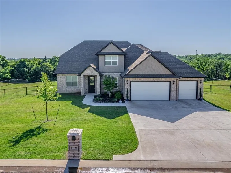 Outdoor living includes a covered back porch with private views of the greenbelt. Located just 25 minutes from Downtown Oklahoma City and 20 minutes from Downtown Edmond, the home combines modern design, energy efficiency, and convenience with easy access to city amenities.