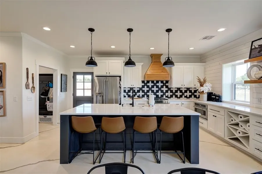 Welcome to your dream home where modern luxury meets serene country living! Situated on 5 sprawling acres, this custom-designed 4-bedroom, 3.5-bathroom barndominium offers the perfect blend of style, space, and functionality. Step inside to discover luxurious modern finishes throughout, including custom epoxy floors, sleek quartz countertops, and a spacious kitchen with a large island and walk-in pantry, perfect for entertaining or daily living! Each of the four bedrooms features oversized closets with custom built-ins, ensuring ample storage and comfort. The layout provides ample privacy for the master bedroom as it is the only bedroom downstairs! Enjoy the convenience of a tankless hot water heater, private water well, and a thoughtfully designed floor plan that caters to both form and function. Outdoors, the amenities continue with an 80’x18’ covered rear patio ideal for relaxing or entertaining, and an attached 40’x40’ workshop, offering endless possibilities for hobbies, storage, or home business needs. This one-of-a-kind property offers privacy, space, and a refined country lifestyle just minutes from city conveniences. Don’t miss your chance to own this incredible home!