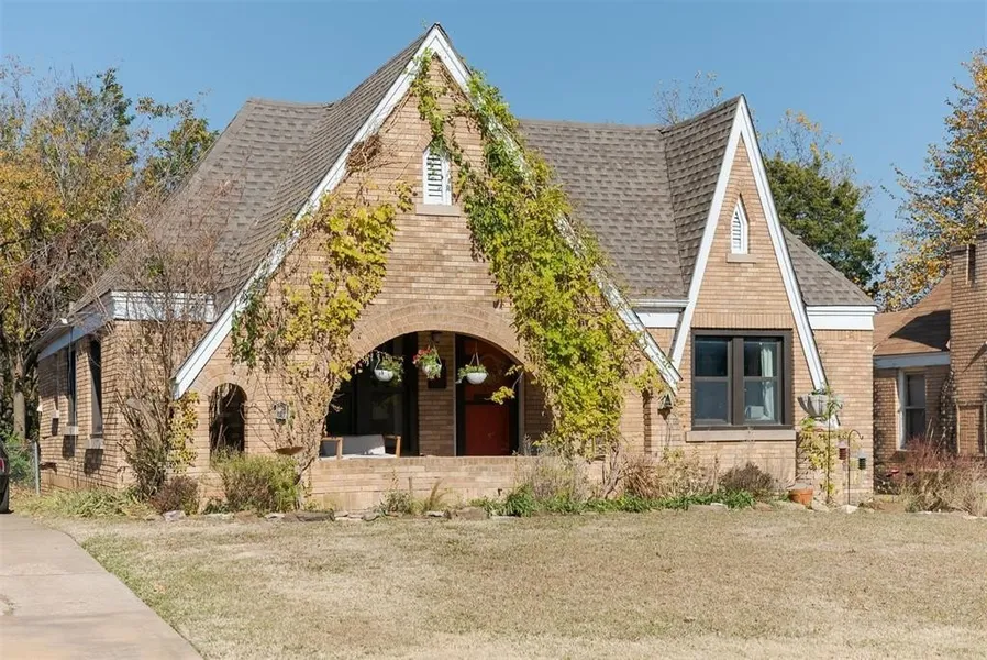 Tucked into the heart of the Shepherd Historic District, this brick Tudor-style charmer feels like stepping into a beloved novel, familiar, warm, and quietly full of character. Its two steeply pitched gabled roofs give the exterior a storybook silhouette, while original wood floors, graceful triangular archways, and a classic brick fireplace preserve the home's early twentieth-century soul. A covered front porch invites slow mornings with coffee, and the rear patio with its open deck creates an easy flow for gatherings or quiet evenings outdoors. Inside, a formal dining room sets the stage for dinner parties both intimate and lively, and the oversized kitchen island anchors a kitchen that blends modern updates with timeless appeal. Thoughtful, contemporary fixtures elevate each room without competing with the home's historic charm. Recent functional updates include new a/c, furnace & sewer line (2024), reverse osmosis water filtration system (2023), and bathroom plumbing (2022). Set within the coveted Cleveland Elementary School District and just a short drive to the vibrant Plaza District, this home offers character, comfort, and the kind of everyday convenience that makes life feel beautifully balanced. It is a place that welcomes you in and encourages you to stay for the next chapter.