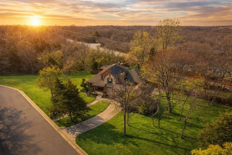 This stunning Edmond home was custom built by McCaleb Homes, offering timeless architecture, designer finishes, and an exceptional setting on nearly 1.5 acres. It feels like country living, while being minutes from the highway, shopping, and amenities. Perfectly positioned on a spacious corner lot, the property is framed by mature trees, lush landscaping, and a serene backyard retreat complete with a beautiful pergola with electricity and charming garden house or workshop. An oversized entry door welcomes you inside to rich wood floors flowing throughout the main level. The dedicated study features wood paneling and French doors - a true statement space. A secondary bedroom on the first floor connects to a full bath with walk-in shower, ideal for guests or multi-generational living. The heart of the home is designed for gathering - an open-concept kitchen, living, and two dining spaces filled with natural light. The chef's kitchen showcases high-end appliances, a new double oven, wine refrigerator, center island, and abundant storage. The living room offers a beautiful fireplace and coffered ceilings, while the larger dining room is a sunlit showpiece overlooking the plush backyard. The private primary suite sits in its own wing with direct patio access and a spa-like ensuite featuring dual vanities, soaking tub, walk-in shower, and an expansive walk-in closet. Upstairs you'll find two additional bedrooms, a full bath, and a spacious bonus room with closet - perfect for a game room, media space, or flex living. Additional highlights include private water well (free water), Class 4 impact-resistant shingles, brand new 8-foot cedar fence enclosing the backyard, four-car garage, extended driveway for additional parking, 22KW Generator, power shades with remote, mini split HVAC in garages, and storm shelter. This is a rare opportunity to own a beautifully maintained custom home with character, space, and privacy - all in one of Edmond's most desirable settings.