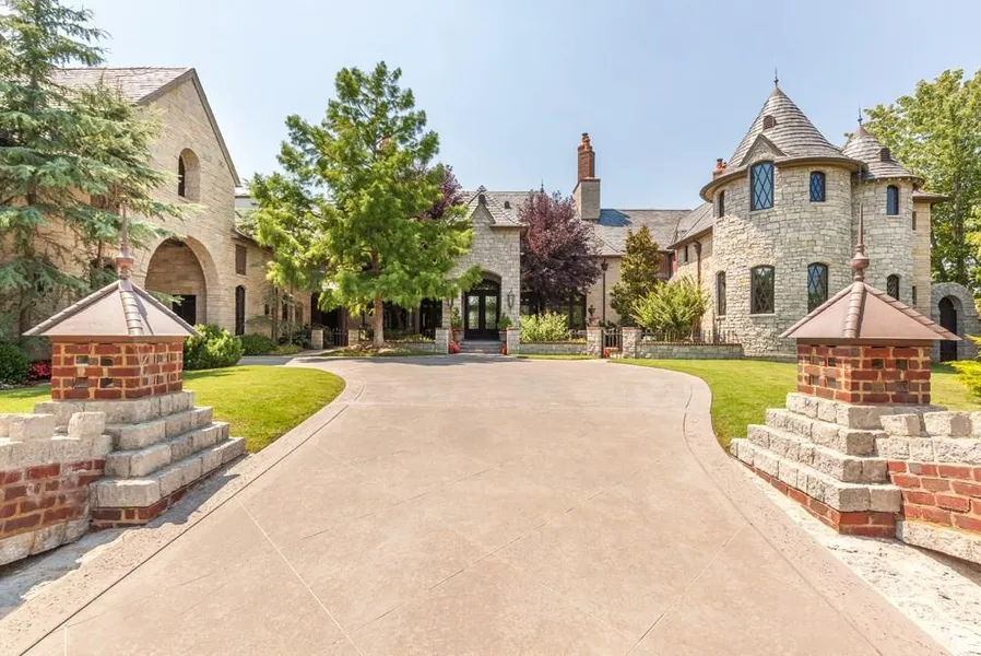 Step into timeless elegance with custom finishes, including hand-hewn ceiling timbers, a testament to fine craftsmanship, and soaring ceilings throughout. The home also features a two-story library with sliding ladders, a built-in aquarium, and a private study. Wine enthusiasts will appreciate the custom wine room accessed via a circular staircase, adding a touch of sophistication. The expansive primary suite offers its own fireplace, his-and-her bathrooms, and an exquisite custom closet with marble floors and generous built-ins.