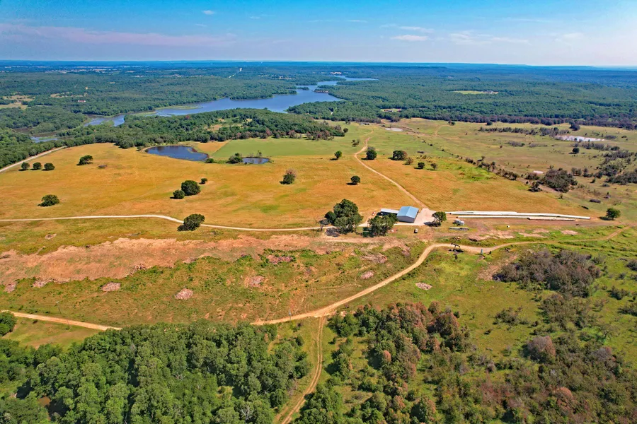 Nestled near the historic Okmulgee and Dripping Springs lakes lies this sprawling 1,540 +/- contiguous acre ranch. Upon entering through the custom stone wall entrance, you will traverse down the 1/3-mile driveway which leads to a large 60 x 100 hay barn and a 30 x 60 shop on a concrete foundation. The diverse landscape has it all including pristine hay pastures, hearty Bermuda and Blue Stem grasses, rock outcrops, live creeks, over 13 ponds, mature hardwoods, and elevation changes. The property has perimeter and cross fencing to help support livestock operations.