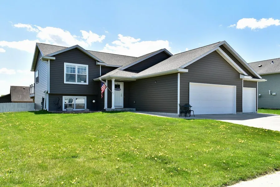 Beautiful move in ready home with an open concept main floor living area and fully finished walk out lower level. This immaculate home has 4 bedrooms and 2 bathrooms with a 16 x 16 maintenance free deck off of the dining room. Some features include: main floor laundry, steel siding, kitchen center island, and an attached 3 car oversized garage which is heated and insulated plus has water. The backyard is private with a fully fenced in yard. The lower level patios door walks out to a cement patio. This home is located in a newer development along a quiet street near a City Park. No need to build when this lovely home is move in ready!
