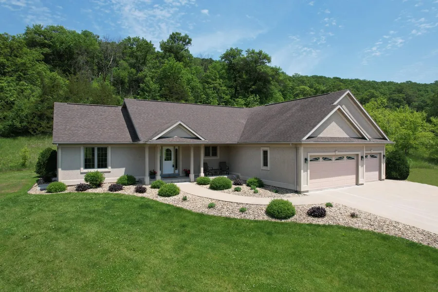 Welcome to your own private retreat nestled in the heart of a peaceful, picturesque valley in Chatfield. This beautiful 4-bedroom, 3-bath ranch-style home sits on 8 acres of mature woods, offering year-round scenic views, unmatched privacy, and endless opportunities to enjoy nature. Step inside to find a spacious open-concept kitchen and living area designed for both comfort and entertaining. The vaulted ceilings, cozy corner fireplace, and abundant windows invite natural light and views of the surrounding woods, blending the beauty of the outdoors with the warmth of home. The main level features three bedrooms: a primary suite with a tray ceiling, a soaking tub, double vanities, and a large walk-in closet. Convenient main-floor laundry adds to the ease of everyday living. Downstairs, you'll find a huge fourth bedroom with its own walk-in closet and an office area-perfect for remote work or a craft room. Enjoy summer evenings on the expansive, maintenance-free deck, sipping coffee on the charming front porch, or letting your four-legged friend roam in the dedicated kennel area. Whether you're an outdoor enthusiast, hunter, or simply seeking peace and quiet, this property offers it all. Located just a short commute from Rochester or Stewartville, this is the ideal blend of seclusion and accessibility. Pre-Inspected!