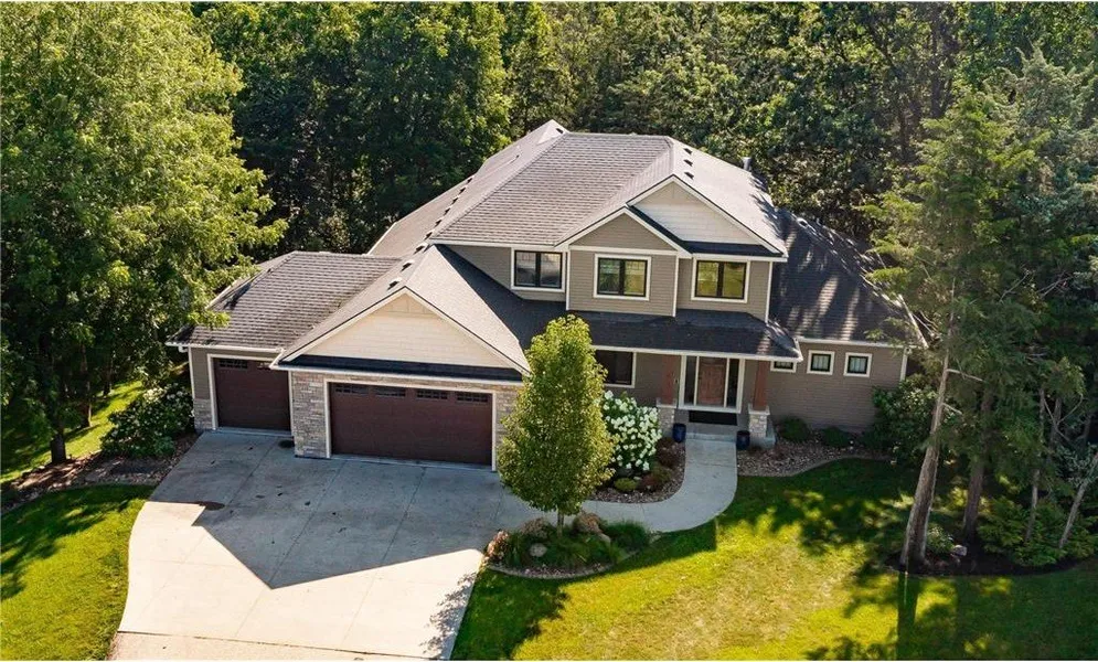 Set on a private acre backing to the Zumbro River, this 2015 custom two-story combines modern design with quality craftsmanship. Nearly 4,000 finished square feet include five bedrooms, four bathrooms, and flexible living spaces designed for both comfort and entertaining. The main level features vaulted ceilings, custom woodwork, and an open floor plan anchored by a spacious kitchen and living area. The primary suite is conveniently located on the main floor. Upstairs, three additional bedrooms offer plenty of room for family or guests. The walkout lower level includes a high-end custom bar, a fifth bedroom, and a comfortable family room that opens to a private patio surrounded by mature trees. Car enthusiasts and hobbyists will appreciate the prestressed garage with shop space beneath, offering endless storage and workspace options. All of this, with city water and sewer, just ten minutes from downtown Rochester.