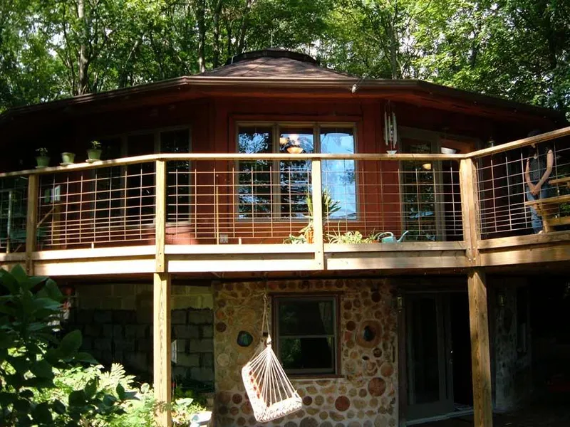 The upper-level is an open floor plan with a high, domed ceiling, plenty of custom-built bookshelves, a modern kitchen with a Redwood Burl Breakfast Bar and a pantry. Recessed lighting and a second gas-log fireplace provide a warm ambience on those brisk fall evenings. French doors give way onto a spacious deck. Off the main room is a second bedroom and a guest bath which contain a vintage claw-foot tub, pedestal sink and pull chain toilet. Both the kitchen and the bedroom have skylights adding natural light and depth. An iron spiral-stairway connects both house levels. This home is additionally well-heated if needed by an outside Taylor wood boiler as well as a forced-air propane furnace.