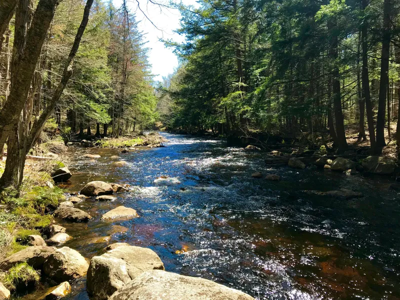 The property sits in the deep woods and is accessed by a seasonal gravel road that is in excellent shape. The land is level from the road to a pretty building site from which is a view of the river, and sounds of the tumbling water can be heard. The forest is a beautiful stand of open hardwood, with mature hemlock along the stream.