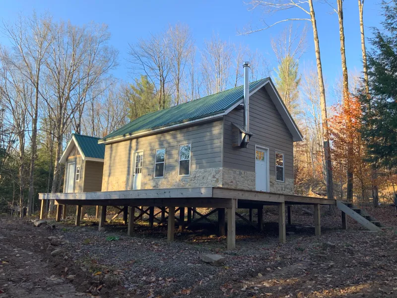 Secluded acreage surrounded by Mad River State Forest (approx. 3,500 acres) offering brand new 16 x 28 cabin shell with 10 ceilings/walls, 2 x 6 construction, piers 7 OC (built to add second floor if desired). Bathroom/ bunkhouse -8 x 8 for additional space. All surrounded by 10 front deck. Plus, a Large Barn 32 x 40 w/ 1610 bump out for storing machinery, ATVs, snowmobiles or custom woodshop for finishing the cabin.