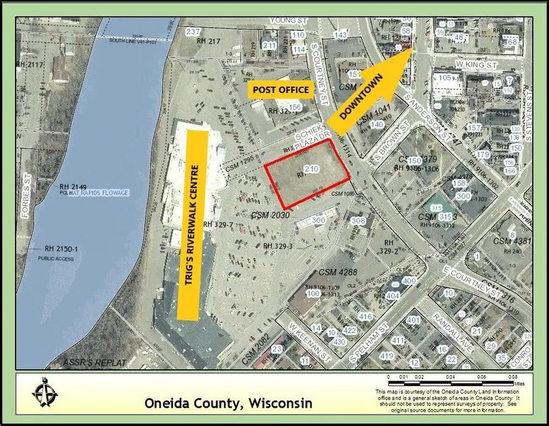 This high exposure commercial building parcel located at the main access to Riverwalk Centre* and directly across from the U. S. Post Office offers 0.88 acres** of level, ready to be built upon land area (38000 square feet) and benefits from a stop and go light controlled intersection. The site consists of 146 feet of Courtney Street road frontage and 257 feet of Schiek Plaza Drive road frontage providing a combined traffic count of approximately 10,000 vehicles per day traffic flow. Rhinelander's main "downtown" shopping district also culminates at it's south end at this location. This is a highly desirable building site for any number of retail, service, fast food, or other business applications. Riverwalk Centre consists of a Supermarket, Pharmacy, and Floral & Gift Shoppe, plus a gas station, a Cafe, Hardware Store, liquor store, and national chain department store. **Per tax stateme...