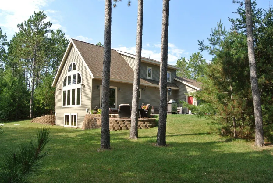 Elegant Mystic Pines home built in 2008. Nestled in on 1.52 acres offers a private setting yet conveniently close location to all schools, commerce, and recreation. Tastefully designed floor plan features a great room with soaring vaulted ceilings. Eat in designer kitchen and dining with easy access to the outdoor living space. Main floor master suite, powder room mud room with laundry hook-ups completes the first floor. Upstairs features 2 bedrooms and another full bath. Fully finished lower level boasts a spacious family room. Abundant storage with a huge laundry room and office. Family oriented yard and patio. Immaculate newer home is efficient and offers lower maintenance luxury living.