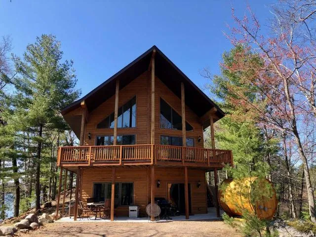 Northwood beautiful Prow front Chalet Style Boom Lake Home built on a peninsula of land this home boasts 360 degrees of lake views with approx. 2000 feet of frontage for privacy. The kitchen features granite counter tops, stainless steel appliances, quality cabinets, & breakfast bar perfect flow for entertaining. The great room enjoys a wood fireplace, cathedral ceilings, oak flooring, walls of windows and patio doors leading to a covered maintenance free deck that wraps around the house. There is a master bedroom, walk in closet, private master bathroom, main floor laundry &half bath to complete the main floor. The second level master bedroom (could be divided for 3rd bedroom) has a private deck, full bathroom, large windows, & a loft area. The walk out lower level is plumbed for a 4th bathroom, has egress windows, patio door to a concrete patio, & can be finished off with 9-foot ceilin...