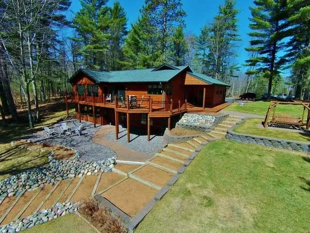 Immaculate Malby Lake property conveniently located in Minocqua. Major updates to this 3 bd/3 bath home include cedar scan log siding, gable cedar shake shingles, & decking. This impeccably maintained one owner walk out ranch is in mint condition inside & out, has a manicured park like setting, professionally landscaped complete w/screened in gazebo, & offers sandy beach frontage. Over 6 acres of privacy & 400' of gentle slope frontage, quiet location, & a beautifully wooded lot with southern exposure. Spacious open floor plan on main level w/knotty pine vaulted ceiling in living room. Abundance of oversized windows & lakeside deck along entire length of home provide marvelous lakeviews from main level. Lower Level features walk out with patio & large family room w/fireplace, 2 more bedrooms & a full bath. Large laundry room w/extra storage & additional stairwell leading to the attchd. 2 car garage. Experience the iconic Northwoods lake living with this ideal family home.