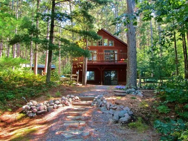This property has a little bit of everything to offer. Level lakefront with 130' sand frontage for swimming, lake with 40' depths for fishing and a very well maintained chalet style cabin in the woods. Located only 5 minutes to town, you won't believe the peaceful feeling that overcomes you the minute you pull up to the home. Situated on 1.94 wooded acres, this one bedroom 2 bath home has it all. Features include natural gas, forced air heating and central air conditioning, walk out lower level, 20'x24' detached garage, drilled well, conventional septic, all appliances included, big deck, wall of windows facing the lake, cathedral ceiling, open concept, finished basement and so much more. Pack your bags and begin enjoying all the Northwoods has to offer today!