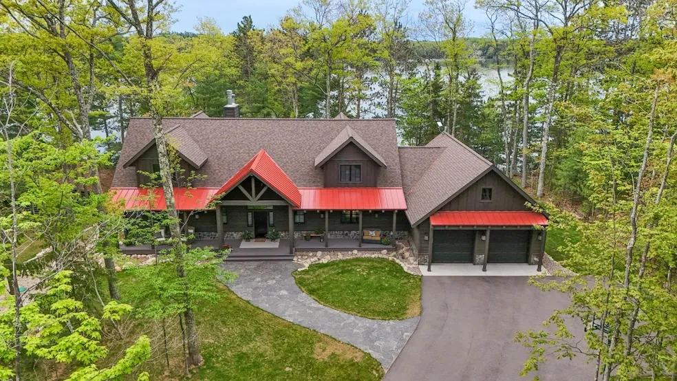 Nestled in the heart of the Northwoods, Lake Katherine proudly wears the crown as the Queen of Lakes in the Minocqua Area. Luxury living at its finest w/this beautifully crafted 6,500 sqft 5BR, 5BA main home (2022) w/2.2AC & 206' of water frtg w/southern exp overlooking an island. Every detail has been carefully curated, from the custom kitchen ft. Wolf & Sub-Zero appliances to the handcrafted birch bark mosaic on the dining room ceiling. The main level fts a spacious primary ensuite complete w/a walk-in closet, along with a grand living room that boasts a stone, wood-burning fireplace & wetbar perfect for cozy evenings. The 2nd level offers 3BR, 2BA providing add. accommodations for family/guests. The LL has 1BR, 1BA, office area & stone wood-burning FP in the rec room. Additionally, the property has a lakeside structure grandfathered in for a future guest home & 64x40 pole barn across the road. Located a few miles south of Minocqua, this home delivers in location, luxury & lifestyle