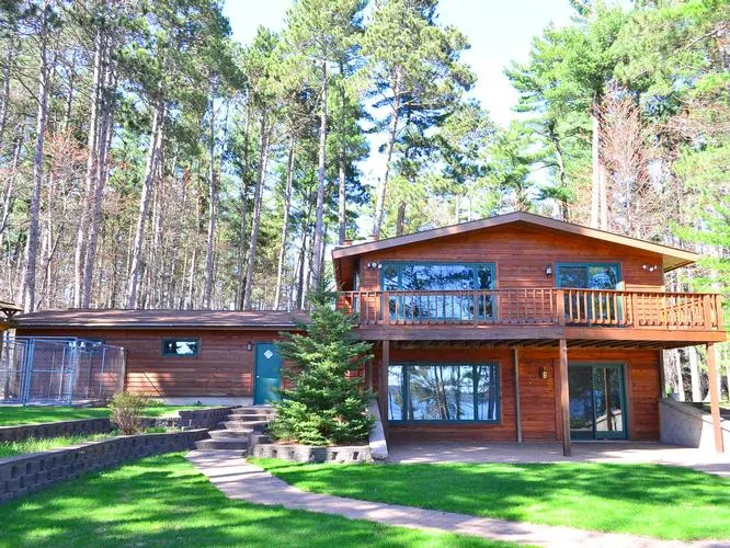 Highly desired Edgewater Pines neighborhood! Only minutes from town, yet secluded in a private upscale community. Spectacular Southwest views from this immaculate property. 150' of impeccable sand shoreline on the renowned Minocqua Chain which offers thousands of acres of recreation and fishing. Professionally landscaped, 1,538 sq. ft. of garage space both with the 2-car attached and 2-car detached. Nearly 3,000 sq. ft. home features 2 fireplace areas, gorgeous lakeside views, formal living room, dining room, renovated kitchen, rec room, and walk-out lower level family room faces the lake. This home has many extras such as blacktop driveway, security system, in ground sprinkler system, and dog kennel runs that lead to the garage. Relax and enjoy the views from the 28 ft. lakeside deck!