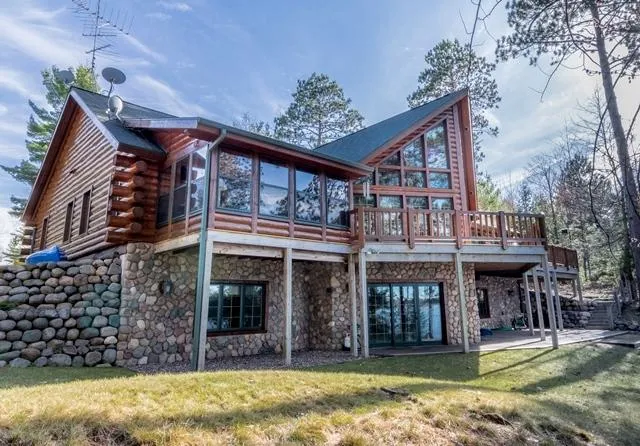 Two Sisters Lake luxury. This extraordinary log home was featured in Country's Best Log Homes Magazine. Secluded setting boasts 6.21 AC & 200' frtg. The 719 acre lake is a hidden gem offering crystal clear waters w/ 63' depths, superb fishing & miles of boating; making Two Sisters one of the top tier lakes in the N'Woods. Distinctive quality & pride in ownership is evident throughout the 5 bdrm / 5 bath home. Stunning first impression of the open & spacious main living area. The vaulted ceiling, log beams, massive fieldstone wood-burning fireplace and wall of lakeside windows define the meaning of a great room. Kitchen showcases a 6'x8' island, granite countertops & designer appliances. High end wood, carpeting & tile flooring throughout. Main floor master suite provides access to the screened in porch. Desirable walkout lower level great for entertaining or kicking back with the family. Attached 2 car garage plus a 30'x50' outbuilding.