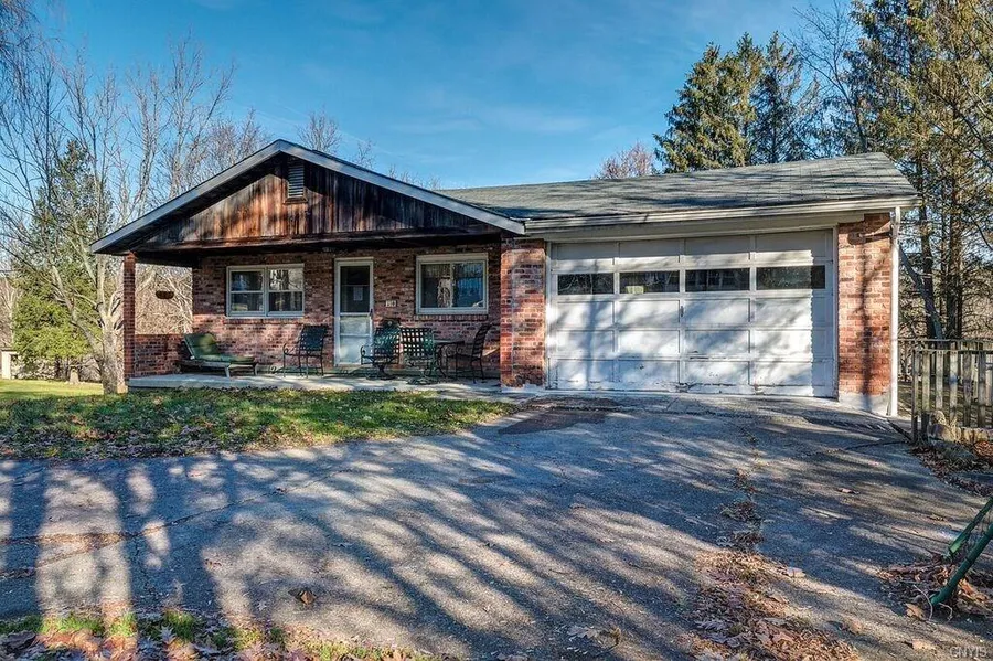 This Ranch Home with almost 2 acres, offers you country living in a Village setting. This 3 bed, 1.5 bath open living room and dining room with beautiful natural gas brick fireplace. Attached 1.5 car garage, large 5 car garage around back under home could offer many opportunities for home business or rental storage of classic cars, a second out building with field also many options for small animals or more storage. Property also backs up to a creek. Come and see the multitude of possibilities.