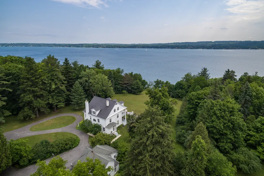 This premier Finger Lakes estate with 23 acres, a wooded ravine highlighted by Bentley Brook, 618' of private Skaneateles Lake frontage with level point & shale beach provides a secluded, quiet haven yet is only 2 miles to the village. The winding driveway bordered by majestic trees leads to a magical place of peace & tranquility. Built in 1902, the home is the birthplace of the Skaneateles Festival, a world-class chamber music festival & is graced with extraordinary architectural details throughout: magnificent entry with dramatic staircase, grand living and dining rooms, 7 bedrooms, 3.5 baths and incredible views of the lake. Several outbuildings: 3-car garage w/apartment, 1 car garage w/workshop & greenhouse, boathouse, "beach" house and permanent dock. A once in a lifetime opportunity.