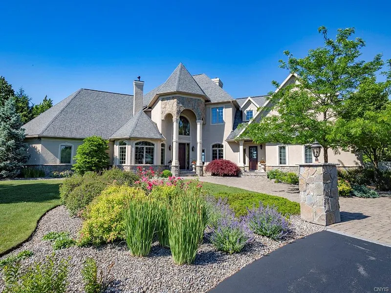 Nothing like this in CNY! 180-degree skyline view! This luxurious impeccably maintained 6 bdrm, 5 full 3 1/2 bath home sits on 1.8 spectacular acres at the top of a quiet cul-de-sac in the sought-after Waterford Woods Neighborhood. Driving up to this European-Style Estate you are greeted w/brick-paved circular driveway, beautiful stone trim accents & pillared entryway. Upon entering, the wow factor continues w/3-story open staircase, 2-story formal dining room & cozy hearth-warmed living rm dazzled w/faux painting by renowned painter Chuck Gridley. The house expands from there into the family rm w/soaring ceiling & a wall of windows, taking in the lovely backyard views & overlooking the sparkling inground pool, putting green, & pool house w/1/2 bath. The eat-in gourmet kitchen shines w/ a 6-burner Wolfe range, Subzero refrigerator, large breakfast bar & granite counter tops. Private 1st fl owner's suite offers 2 sided fireplace, spacious bath, large walk-in closet & tray ceiling. The 2nd fl is home to 4 bdrms each w/ensuite baths. Bonus indoor basketball court/gym just for fun or NBA hopefuls. Lower-level theater rm/rec area, workout rm/bdrm & full bath complete this amazing home!