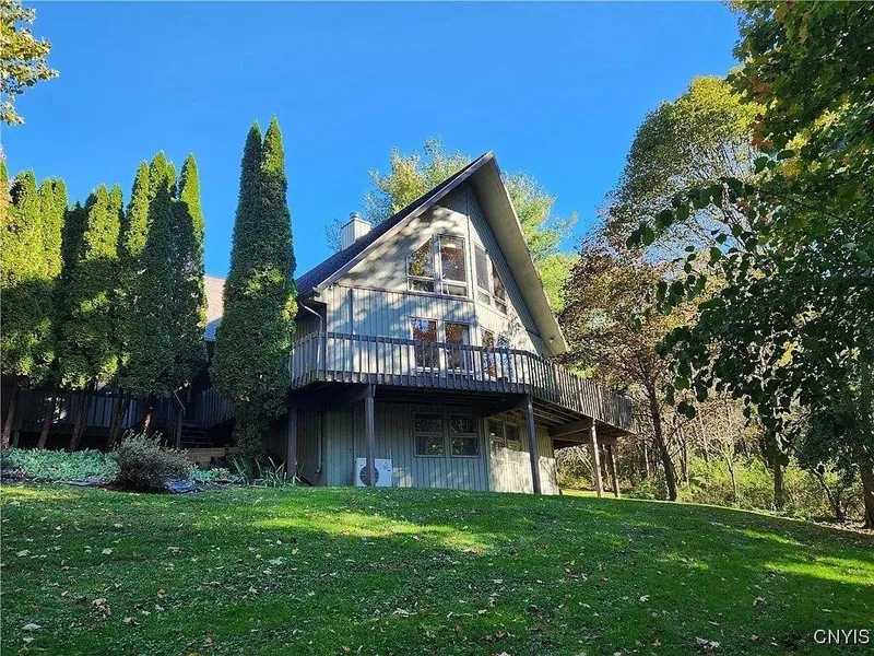 Overlooking Skaneateles Lake, move-in ready, well built cedar home with deeded lake rights and dock across the street. Impressive home is graced by expansive wrap around decking, handsome craftsmanship showcasing vaulted ceiling with open loft. Set on the hillside across from the Lake, enjoy treed privacy with a great seasonal view of the water from all three levels! Three levels of living space, offer over 2000 sf plus 900 sf walk-out ground level. Hardwood floors main level, west wall of windows on all 3 levels, full baths on all 3 levels, suitable bedroom space on all 3 levels. Contents negotiable. Eight neighbor families equally own the lakefront. Insurance, taxes and maintenance split 8 ways. Lake lot is 2nd property south of The Sailing Club (no parking please on lake lot lawn)