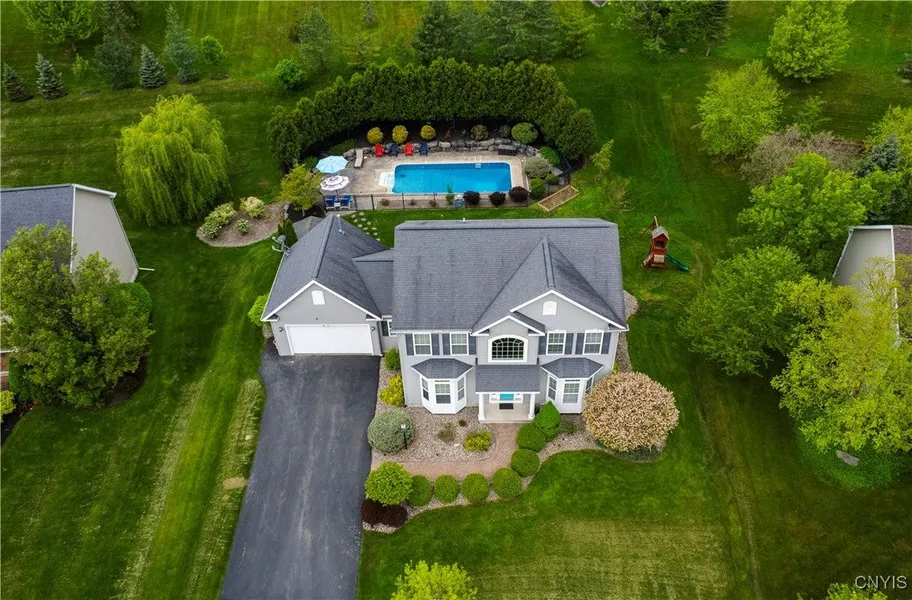 Welcome to Boulder Heights—one of the more sought after neighborhoods in the Jamesville-DeWitt School District—where this elegant 4-bedroom, 3.5-bath colonial blends classic charm with modern comfort and flexible living spaces. Set on a beautifully landscaped lot, this home has been thoughtfully refreshed with new interior paint throughout and updated landscaping that enhances both curb appeal and backyard privacy. Step inside to discover rich hardwood floors, high ceilings, and oversized windows that flood the home with natural light, creating an airy, uplifting ambiance from room to room. The front living room, complete with custom built-ins, is the perfect space for a home office, cozy library, or quiet retreat. Just beyond, the open-concept layout brings everyone together in a sun-filled family room with a gas fireplace, seamlessly connected to a spacious eat-in kitchen. The kitchen is a beautiful, featuring sleek granite countertops, a new gas stove, stainless steel appliances, a breakfast bar, and abundant cabinetry for effortless organization. Whether you're hosting a holiday gathering or enjoying your morning coffee, this space is as functional as it is beautiful. A convenient first-floor laundry room and half bath and large dining room complete the main level. Upstairs, four generously sized bedrooms await, each with brand-new carpeting and plenty of closet space. The luxurious primary suite offers a private ensuite bath, dual vanities, and a walk-in closet that checks every box. Need more room to grow? Head downstairs to over 700 sq ft of finished basement space, including a second expansive family room with a gas fireplace, a full bathroom, and a bonus room perfect for an office, gym, or guest suite—plus plenty of additional storage. Step outside and you'll feel like you've arrived at a private resort. A large deck with a retractable awning offers shade and comfort, while the gorgeous in-ground pool and lush landscaping invite you to relax and unwind all summer long. Bright, beautifully updated, and move-in ready—this home is truly the full package.**Offer deadline set for Monday 5/18 at 12:00 p.m. Will review at 3:00 p.m.**