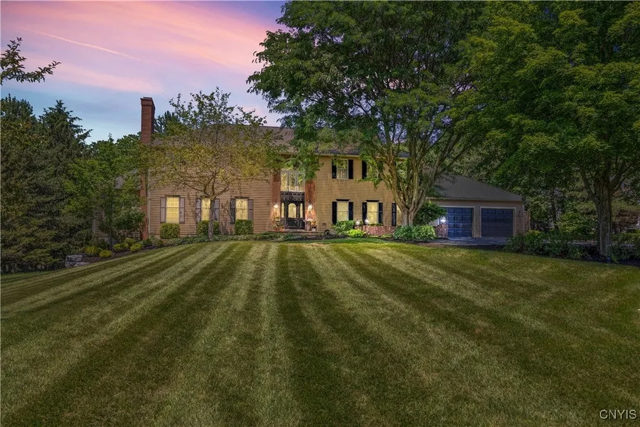 BRAND NEW ROOF with 50 year transferable warranty (complete tear off), New Skylights & Fresh Top Coat on the driveway July 2025! Sophistication & style throughout this exceptional custom colonial on a very private estate size cul de sac lot that backs up to Limestone Creek with no homes behind! This open concept floorplan offers so much flexibility! The 1st floor has freshly refinished hardwood flooring, grand 2 story open foyer with sweeping staircase, 2 fireplaces, 2 half baths, XL laundry room with cherry cabinets, solid surface countertops, formal living/dining/family room, home office & Gourmet kitchen! The Kitchen comes complete with high end appliances including a Sub-Zero Refrigerator, solid surface countertops & oversized butcher block island with breakfast bar. The second level offers 5 large bedrooms, 2 linen closets & 2 remodeled bathrooms. The Owners bedroom suite offers a gas fireplace surrounded by built in shelving, custom walk-in closet with built ins and Spa like bathroom. The Owners bathroom has dual vanity sinks with solid surface countertops, oversized soaking tub that offers elevated views of the impressive back yard & walk in glass enclosed shower. The walk out basement provides an additional 1500 square feet of living space w/ a large family room & gaming room complete with wet bar, office or potential 6th bedroom, full bathroom, work out room, gift wrapping station & 2nd laundry room complete with a dog washing station! This space offers lots of natural light and double glass doors that lead to a patio and the pool area. The lower level could easily be used as an in-law space or teen suite! The oversized 2 gar heated garage (Gas Renzor) is over 30' deep and offers Hot/ Cold water hook ups, an epoxy floor & beverage cooler! Outside enjoy the back deck with views of the heated saltwater pool & lush landscaping including a built in firepit. The exterior of the home has exterior speakers, extensive fencing, walkways, patios w/ LED lighting, motion & spotlights! This is a perfect 10! Very desirable location on a spectacular private lot! Fayetteville-Manlius Schools!