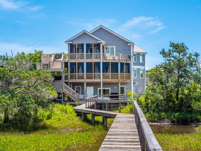 1144 N Anderson MLS Enter down the live oak covered drive into your private space on the deep water sound in Topsail Beach. This beautiful custom home that has been meticulously maintained boasts some of the most breathtaking views on the island. The reverse plan gives you sweeping views of the sound from the entire living area. Screened porches as well as open decks expands the living and entertaining space on both levels. Hardwood floors and vaulted ceilings are just some of the features of this fully furnished home that could be used for full time living or family vacationing. This home is wired for a whole house generator. Stainless steel appliances are featured in the kitchen with granite counters and a bar that seats 6 in addition to the dining area. Abundant storage throughout, walk in pantry, a laundry room with utility sink, large closets, two car garage with workshop and place ...