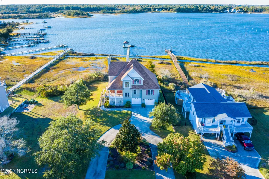 Welcome to this custom-built waterfront home, designed for coastal living and the enjoyment of amazing sunsets and southern ocean breezes. Offered by the original owners, this property boasts spectacular views of Chadwick Bay and is located in exclusive Pelican Point subdivision where homes have recently sold for over 1M. Spend the day relaxing on the decks or porches or out on the water fishing or boating off of your private dock with a 4000 lb boat lift in a covered slip. Upon entering the home, you will immediately appreciate the open concept floor plan. The dramatic 2 story oversized living room welcomes you with water views, a wood burning fireplace and tons of natural light. The kitchen has had a total remodel in 2019 featuring solid wood Kaftmaid cabinets, quartz countertops, stainless steel appliances, & soft close drawers. The kitchen is equipped with a dumb waiter which makes b...
