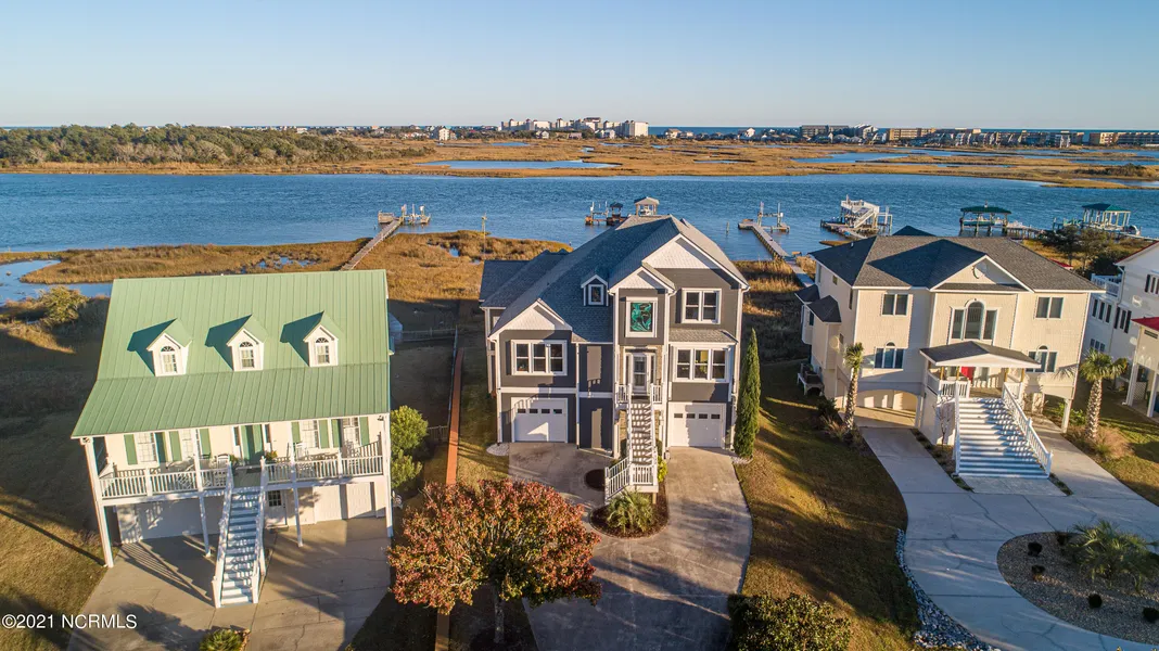 This spectacular Intracoastal Waterway front residence offers the very finest of Carolina waterfront living with DEEP water located only 5 miles to the ocean cut. This is a rare offering that presents the opportunity to own one of the region's finest coastal homes in sought after Pelican Point. This 3800 sq ft home was custom built in 2005 is meticulously maintained and no expense was spared during the build. The home sits on a high, elevated lot in federal flood zone for peace of mind and affordable insurance. The living quarters include a luxurious main residence with a wood paneled elevator and a full apartment on the ground floor, perfect for guests or multigenerational living. You will be amazed by the great room featuring a soaring stone gas fireplace and 2 story ceilings with elegant wood beams. Beautiful hardwood floors and wood trim elegantly flow through the home. Imagine entertaining your family and guests the expansive deck where the views at dusk of the lighted dock are breath taking. This home is truly special! The kitchen has solid wood cabinetry and high-end appliances such as a gas Thermador cooktop & Bosch dishwasher. The large master suite features a lighted tray ceiling and a stunning sitting room offering fantastic water views with a unique wood ceiling. Enjoy the luxury adjoining bath with double vanities, a soaking tub, and a vaulted ceiling. The magnificent study on the main level is also a 5th bedroom. Upstairs, you will find 2 more bedrooms with water views and a full bath. The exterior of the home has Hardy board siding and a certified fortified roof was installed in 2018.Composite decking and PVC railings make for worry free maintenance. The private dock features 2 lifts and a covered boat slip. This provides the perfect launching point for days spent boating and fishing in the ocean or exploring the nearby pristine beaches and sand bars. The drive through garage with a rear garage door makes carting all your water toys