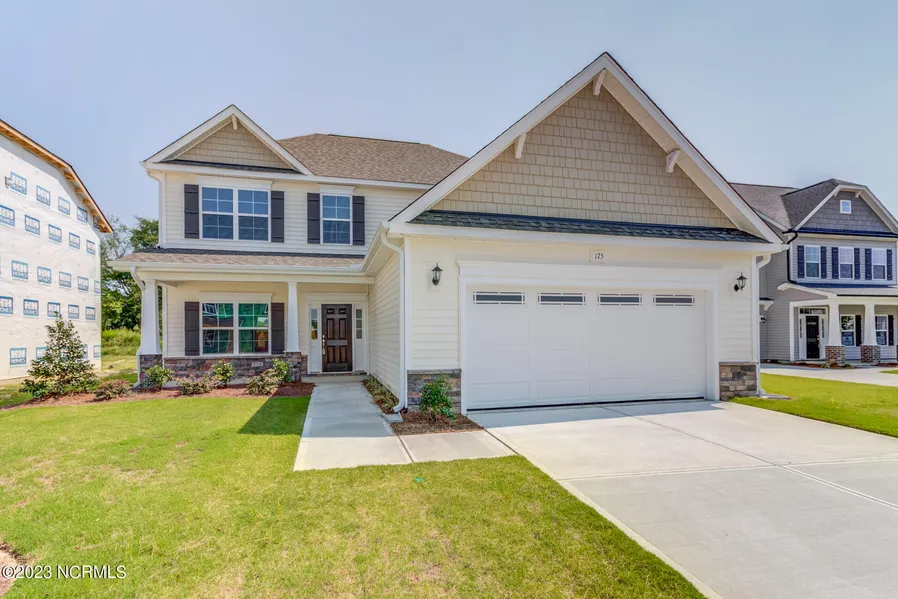The beautiful Clayton home plan, Elevation D, now under construction at Oyster Landing in Sneads Ferry! This two story home plan boast over 2500 heated square feet with four bedrooms and a home office. The primary suite is located on the first floor and comes complete with tray ceiling with crown molding, a large soaking tub and separate shower, dual vanities, private water closet and spacious walk in closet. Enjoy an open kitchen to living area with fireplace. The kitchen includes a large kitchen island, pantry and bright white kitchen cabinets and is just off the formal dining room. Other features include a mudroom, central staircase and large loft area and second floor laundry room. NOTE: Floor plan renderings and photos are similar and solely representational. Measurements, elevations, and design features, among other things may vary in the final construction. Call to verify.
